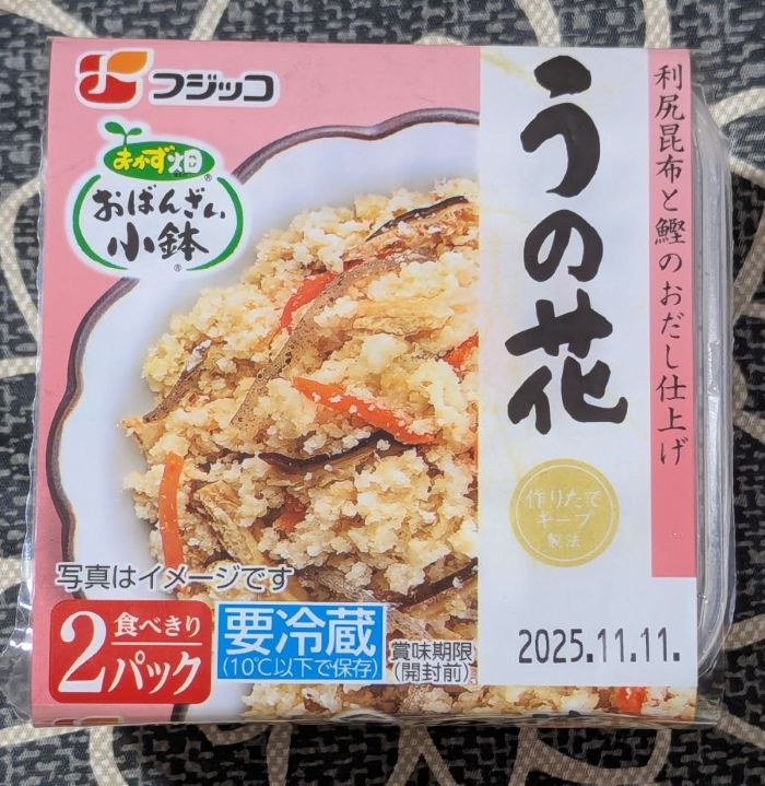 このお惣菜パックとてもおいしかったです。商品棚にあることは前から知っていたのですが、手に取る機会がなく、今回初めて食べてみました。おから・こんにゃく・にんじん・しいたけが入っており、特におからの舌触りが非常に良く、とてもおいしかったです。また、うの花がおからであることを初めて知りました。機会があればまた食べたいです。